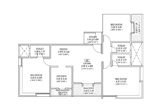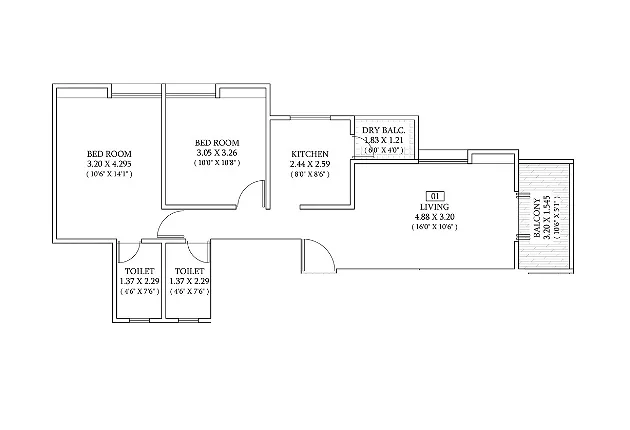 - Configuration 2 Bedrooms, 2 Toilets, Living, Dining, Kitchen, Balconies